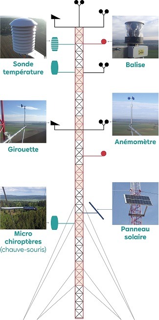 Un mât de mesure est installé afin de recueillir des données locales. Ce mât de mesure, d’une hauteur d’environ 106 mètres, est équipé de plusieurs types d’instruments de mesures, à différentes hauteurs : des girouettes (direction du vent) et anémomètres (vitesse du vent). Des micros à ultra-sons y sont également installés durant certaines périodes de l’année, afin de compléter les données de l’étude faune et flore sur l’activité des chauves-souris en altitude.